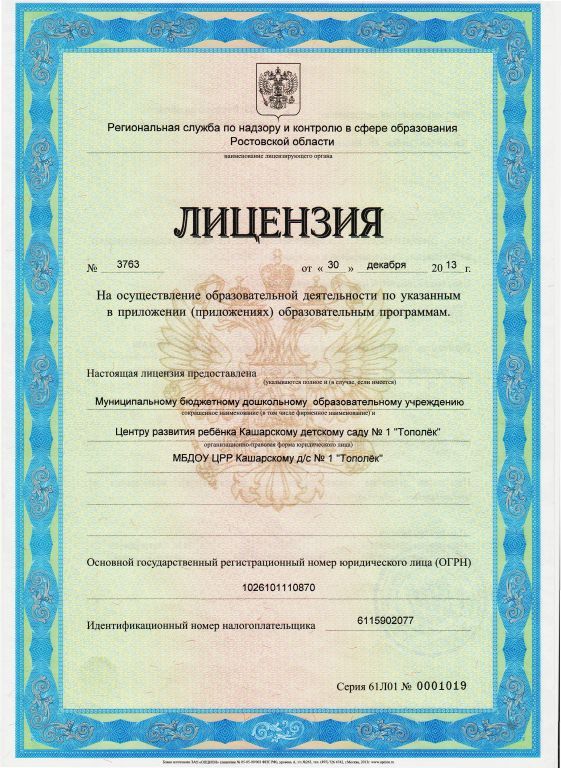 | Полное наименование образовательной организации* | Муниципальное бюджетное дошкольное образовательное учреждение Центр развития ребенка Кашарский детский сад № 1 «Тополёк» |
